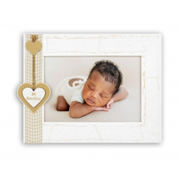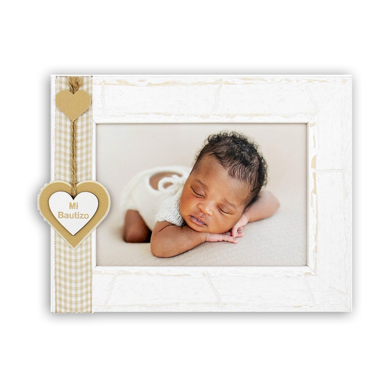 Marco de madera decorado con cinta de raso y yute para bautizo. Colores rosa, azul y marrón. Fotografía incluida en el precio si compras 5 ó más unidades. Envíanos tu archivo si es tu caso.