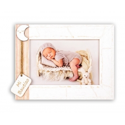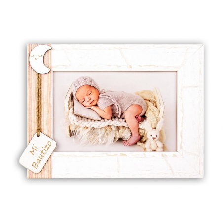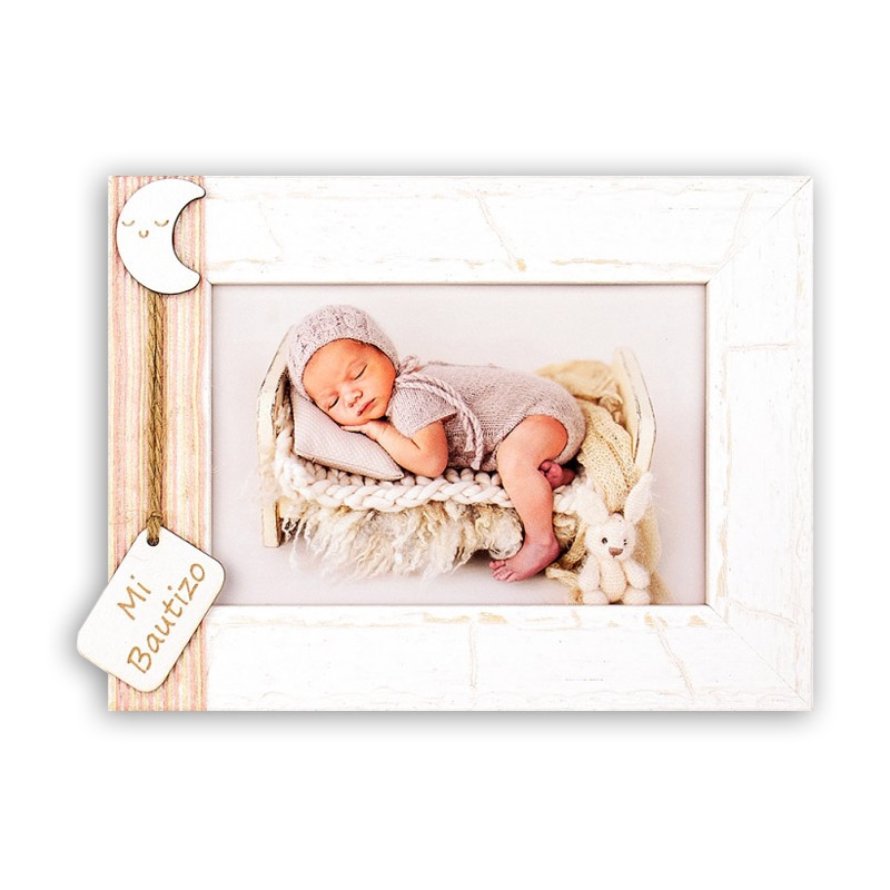 Marco de madera decorado con yute para bautizo. 10x15 cm. Fotografía incluida en el precio si compras 5 ó más unidades. Envíanos tu archivo si es tu caso.