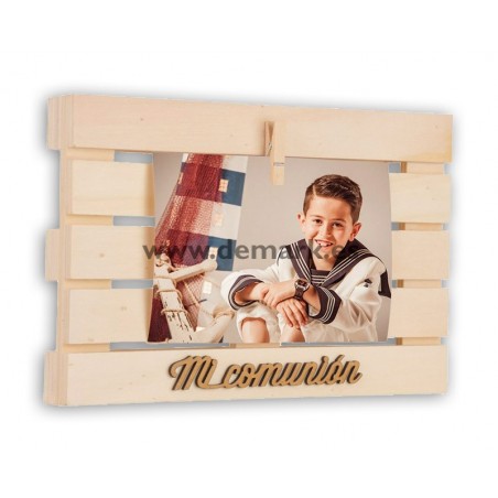 Marco de Comunión en forma de palet para fotografía 9x13 ó 10x15 cm. Válido para sobremesa o colgar. Tamaño exterior: 16x24 cm. Fotografía incluida en el precio si compras 5 ó más unidades. Envíanos tu archivo si es tu caso.