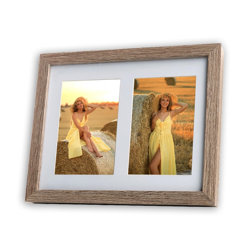 Marco de madera con paspartout para dos fotografías de tamaño 10x15 cm. Tamaño exterior aprox. 28x23 cm. Uso en sobremesa.
